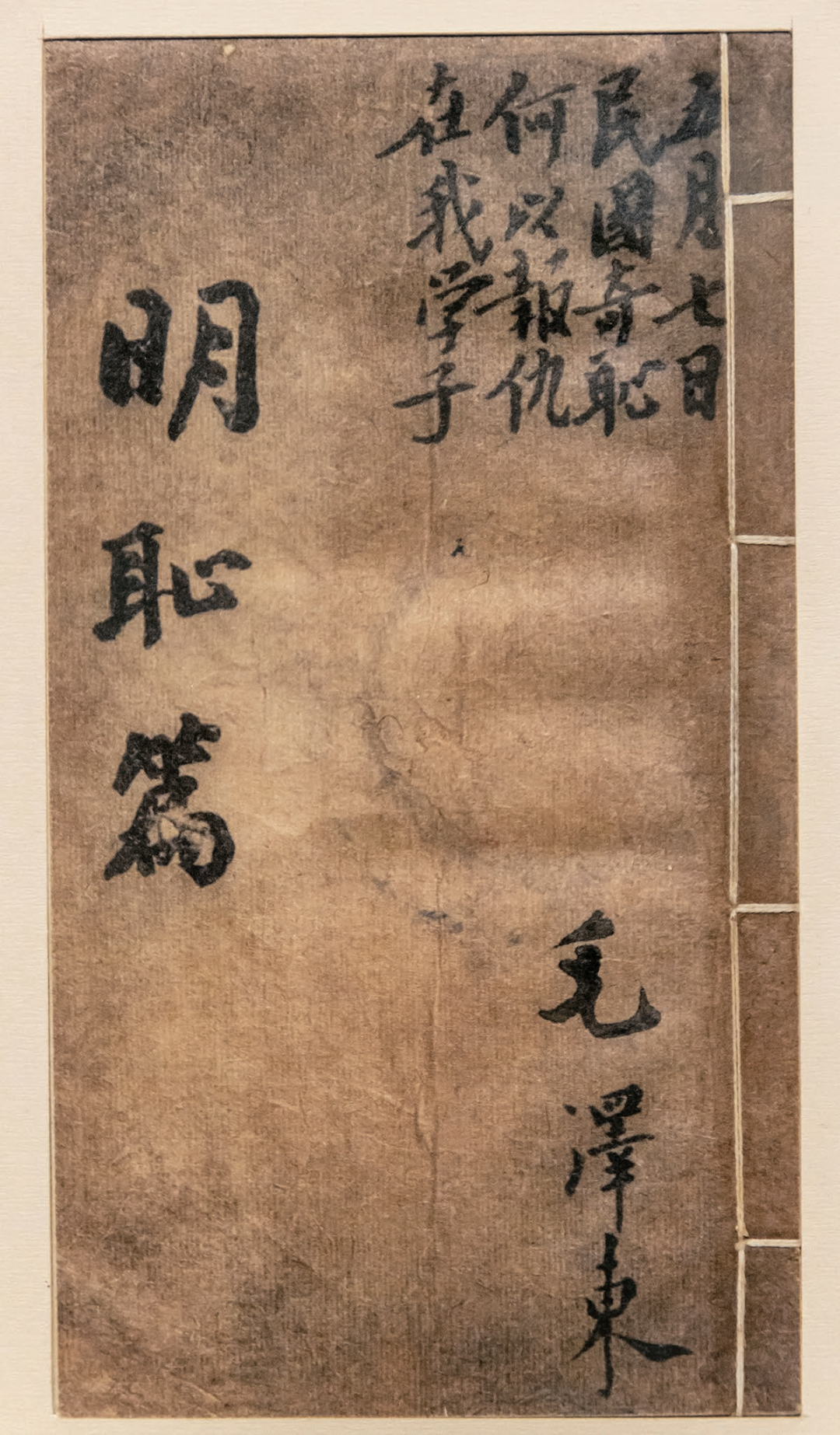 1915年5月,在得知袁世凯接受了日本提出的“二十一条”后,湖南省立第一师范学校的师生们编印了揭露日本侵略和袁世凯卖国罪行的爱国文集《明耻篇》。毛泽东在此书封面题写:“五月七日,民国奇耻。何以报仇?在我学子!” 海峰/供图