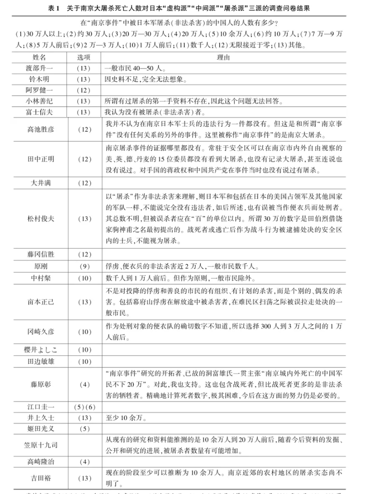 东京审判被告方完全否认屠杀,检方提交的证据中推定屠杀26万人,法庭判决为20万人以上。数字问题成了20世纪80年代后日本关于南京大屠杀争议中的重要争论点。“虚构派”与辩方一样,完全否认屠杀;“中间派”主张的数字在数千至4万余人之间;“屠杀派”主张的数字为10万至20万人之间(参见表1)。